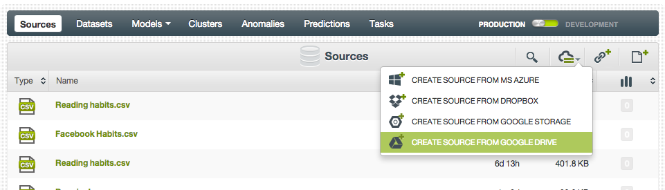 This page helps you quickly create your first source, dataset, model, and prediction.